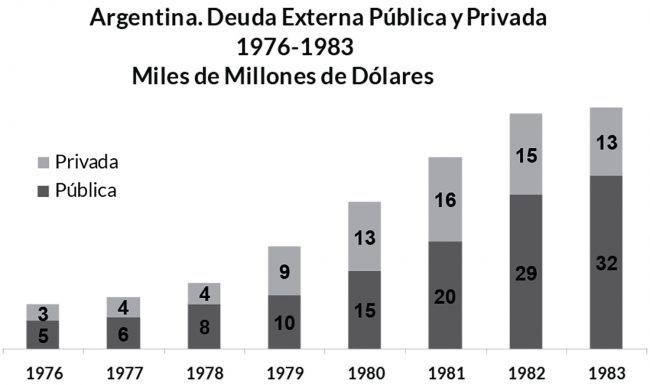 De estas cifras surge que la dictadura aumentó la deuda externa pública 7,4 veces, mientras que la deuda externa privada subió 3,7 veces y empezó a reducirse desde que en 1982 el BCRA comenzó a estatizarla para salvar a las empresas.