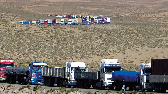 Al final de la tarde, llegamos a Pisiga, caserío boliviano adormecido que marca la frontera. Capiano y su compinche no se olvidan de cargar el tanque allí: en Chile, el combustible cuesta dos veces más caro (el equivalente de 80 céntimos de euro por litro). Luego, se van a estacionar ante la barrera ya cerrada, para poder cruzarla entre los primeros a la apertura de la aduana, al día siguiente a las 8 de la mañana –las 9 del lado chileno–. Detrás de ellos, pronto vienen camiones y ómnibus a encolumnarse a lo largo de centenares de metros. Uno de los conductores comenta: “Y esto no es nada. Durante la huelga de los aduaneros chilenos [en noviembre de 2013], éramos miles los que quedamos bloqueados durante días en la frontera”. Según la Cámara de Exportadores bolivianos (Camex), el 40% de las exportaciones del país, es decir, alrededor de 1,5 millones de toneladas por año, deben transitar por los puertos del vecino chileno.